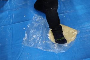 うどん作りの説明 生地を作りに力をこめて