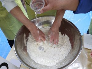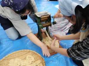当日は、まず諸注意の説明を行った後、小麦粉をこねるところからスタート。足踏みでしっかりと生地を練り、引き延ばし、裁断までの一連の作業を参加した皆さんで楽しく体験しました。