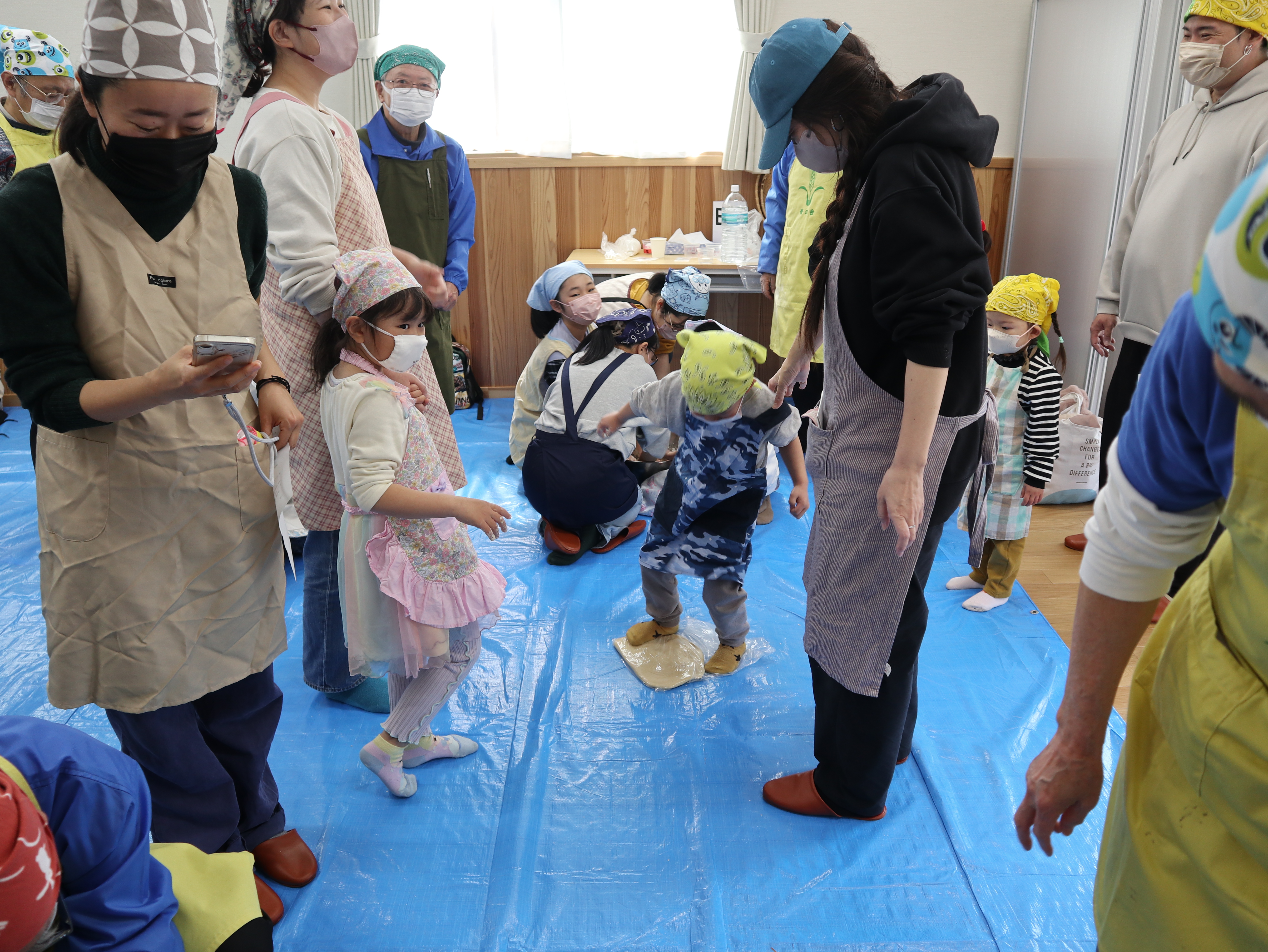 当日は、まず諸注意の説明を行った後、小麦粉をこねるところからスタート。足踏みでしっかりと生地を練り、引き延ばし、裁断までの一連の作業を参加した皆さんで楽しく体験しました。