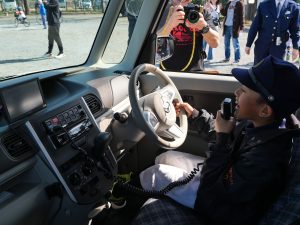 また、ミニパトカーを囲み、車両からの死角についての説明も受け、交通安全への理解を深めました。